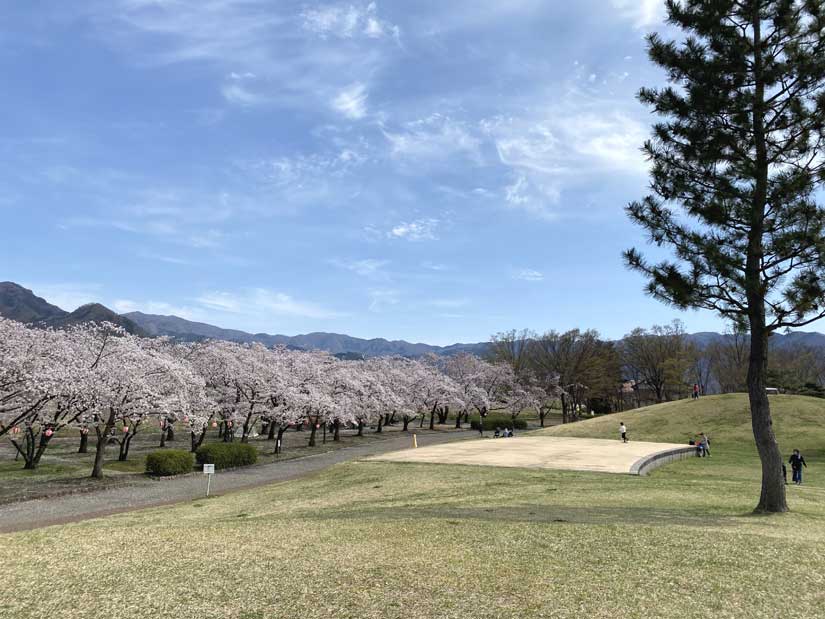 長野県長野市にある武田信玄と上杉謙信が戦いを繰り広げた歴史的な合戦の地としても名高い「川中島古戦場史跡公園」。現在は緑豊かな公園で、広い芝生広場を囲むように約100本の桜が咲き誇ります。公園は市民の憩いの場となっており、遊具や池をはじめ、プラネタリウムを備えた長野市立博物館などもあります。