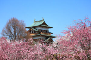 築城当時、諏訪湖の水が城際まで迫り、湖上に浮いて見えたことから、別名「諏訪の浮城」と呼ばれた「高島城」。周囲にソメイヨシノやシダレザクラが約90本ほど植えられ、天守閣や石垣によく映え、春ならではの諏訪の情景を満喫できます。夜は天守閣がライトアップされ、ぼんぼりに照らされたサクラと相まって幽玄な雰囲気を醸し出します。